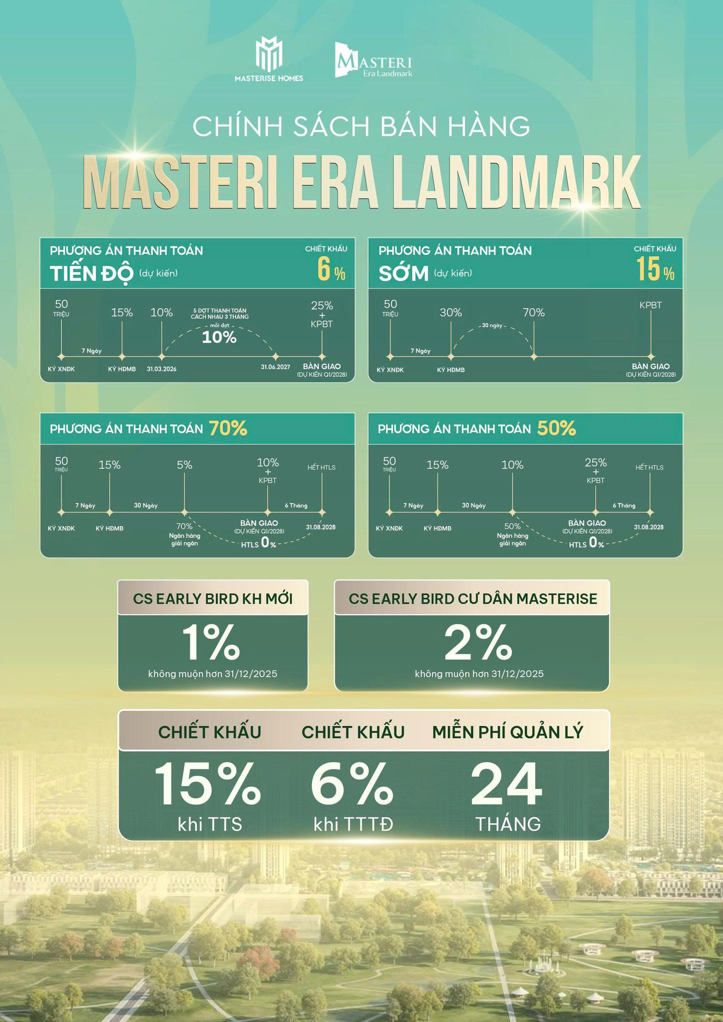 - Chương trình Early Bird chiết khấu cho khách hàng tiên phong với mức chiết khấu 1% giá bán và Tặng 12 tháng phí dịch vụ quản lý.